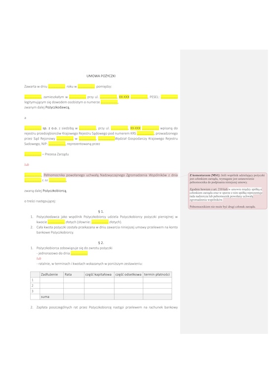Zestaw dokumentów do legalnego zawarcia pożyczki pomiędzy wspólnikiem a spółką z o.o., w tym umowa oraz gotowy protokół NZW z uchwałami o zgodzie i powołaniu pełnomocnika. Idealne rozwiązanie, gdy wspólnik pełni także funkcję w zarządzie.