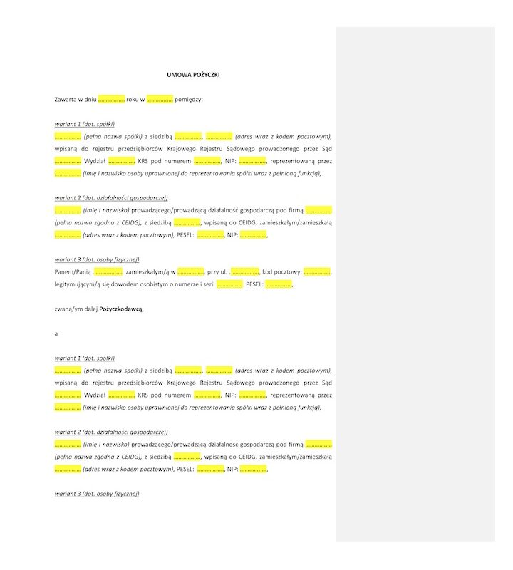 Nasz wzór umowy pożyczki prywatnej i firmowej to gotowe rozwiązanie w formacie Word. Dokument został opracowany tak, aby maksymalnie zabezpieczyć interesy Pożyczkodawcy przy zachowaniu przejrzystości dla Pożyczkobiorcy.