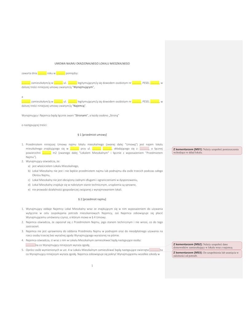 Umowa najmu okazjonalnego wzór to profesjonalna umowa przygotowana przez naszych prawników. Zabezpiecz swoje interesy i skorzystaj z gotowej umowy z fachowymi klauzulami. Kompletna umowa wraz z załącznikami i komentarzami do prostego uzupełnienia.