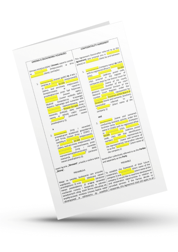 W naszym sklepie możesz nabyć także umowę o poufności – wzór w wersji dwujęzycznej polsko-angielskiej. To idealne rozwiązanie dla przedsiębiorców działających na rynku polskim, którzy współpracują z podmiotami zagranicznymi. Pamiętaj, że choć jest to angielska wersja językowa, wszystkie jej postanowienia zostały przygotowane w oparciu o prawo polskie, co zapewnia pełną skuteczność prawną w Polsce. Kupując, otrzymujesz obie wersje językowe wraz z uzupełnionym przykładem nda dla Twojej wygody.