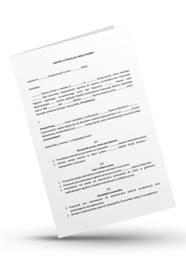 W praktyce oznacza to, że pracodawca w trakcie próby ocenia kompetencje, sposób wywiązywania się z zadań i dopasowanie do organizacji, a pracownik poznaje zakres obowiązków i kulturę pracy. Jeżeli interesuje Cię umowa na okres próbny – wzór odpowiadający aktualnym regulacjom i gotowy do natychmiastowego użycia, skorzystaj z przygotowanego przez nas szablonu.