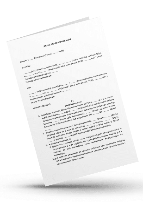 Gotowy wzór umowy sprzedaży udziałów w spółce z o.o. 2025 przygotowany przez prawników. Zawiera wszystkie kluczowe postanowienia – określenie stron, liczbę i wartość udziałów, cenę, obowiązki stron, poufność oraz zgłoszenie zmian do KRS. Wzór pozwala szybko i bezpiecznie przeprowadzić transakcję sprzedaży udziałów.